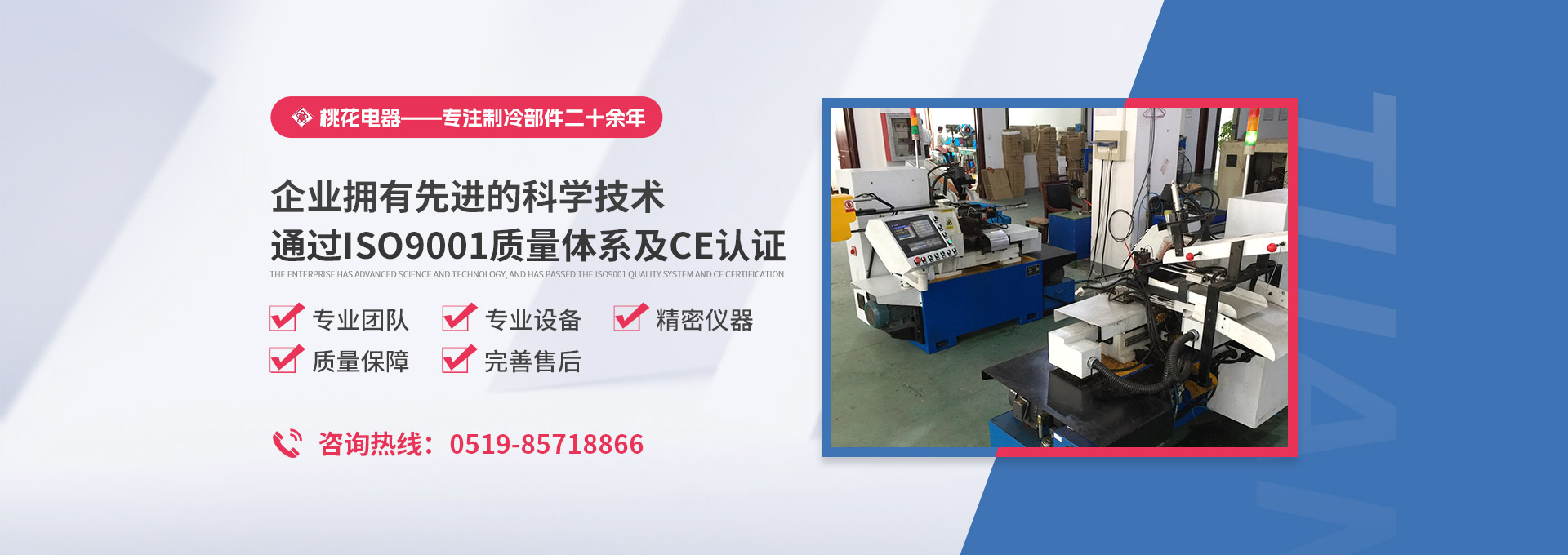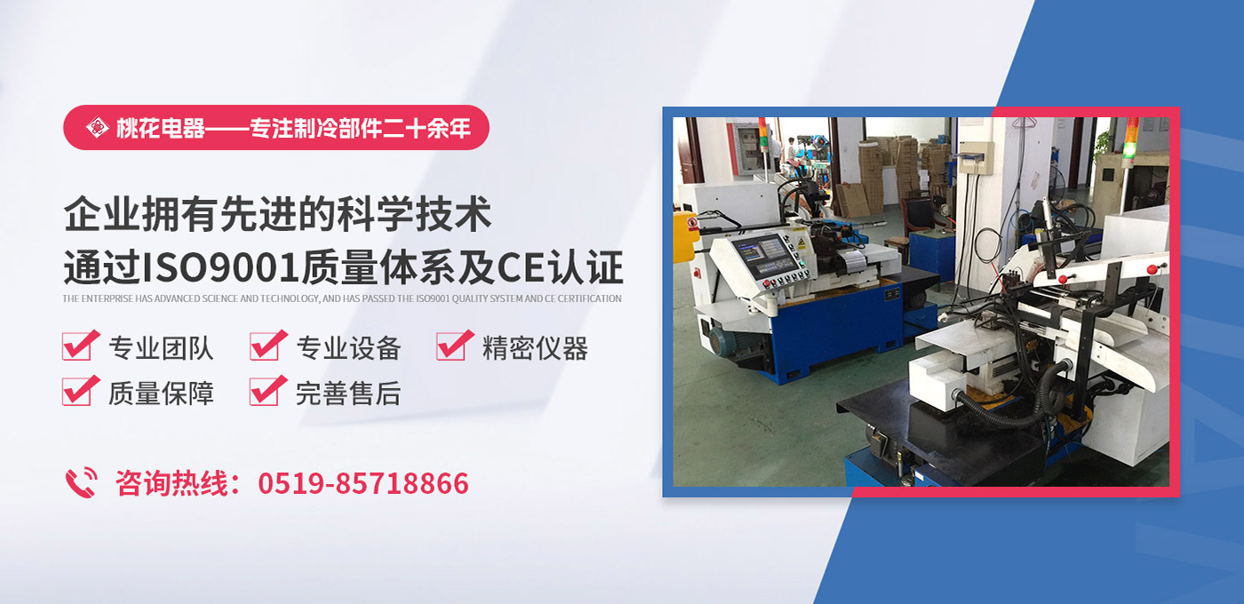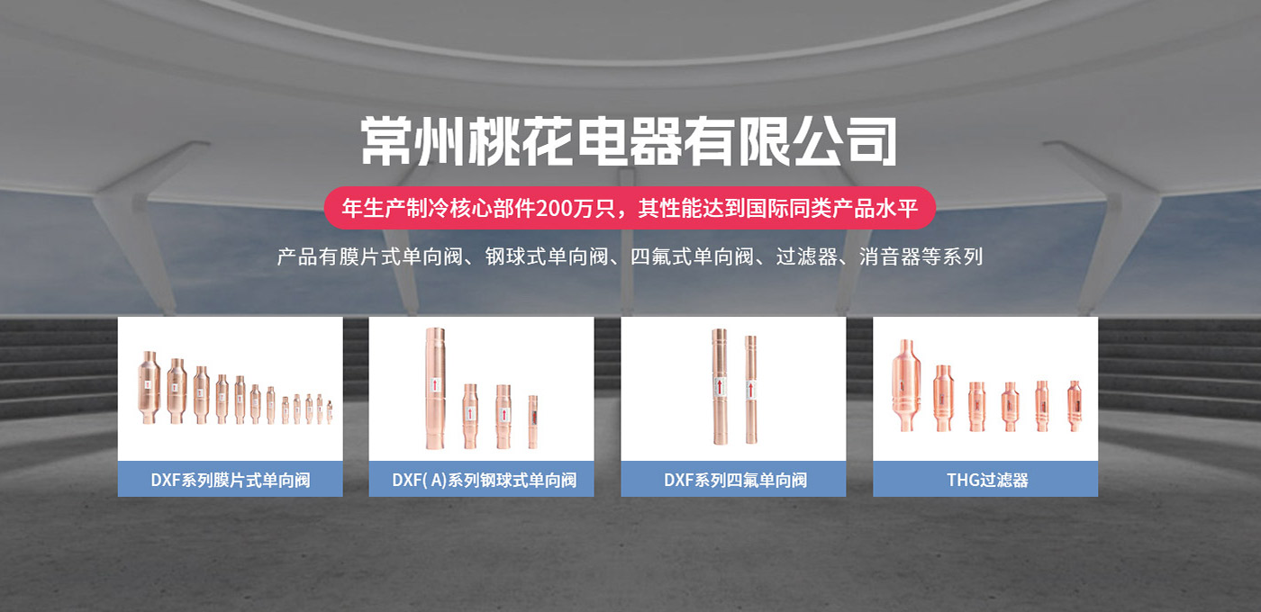 常州桃花電器有限公司地處中國長江“金三角”之稱的上海至南京高速公路、城際高鐵、常州高新經濟技術開發區路段,交通便利、技術力量十分雄厚。它是集研究、開發設計、制造和經營制冷核心部件的企業,主要生產中央空調上使用的制冷部件。產品有膜片式單向閥、鋼球式單向閥、四氟式單向閥、過濾器、消音器等系列。年生產制冷核心部件200萬只,其性能達到國際同類產品水平?! ∑髽I擁有先進的科學技術、國際先進的生產加工設備和精密的檢測儀器,并已通過ISO9001質量體系及CE認證,公司歷史悠久,2000年起,經過長期積累、沉淀,經驗豐富,從而保證了產品的高質量、高性能、高耐用性。企業產品在國內外市場具有較高的知名度,深受眾多中外品牌制冷客商的好評。主要客戶有約克、麥克維爾、美的、開利、特靈、頓漢布什、清華同方、天加等.并出口北美、歐洲、東南亞等地區?! 「咂焚|產品是企業的保證,周到服務是合作友誼的承諾,企業本著“求